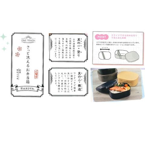 お弁当箱の内側にクリア塗装を施しており、洗いやすく傷や汚れがつきにくくなっています。