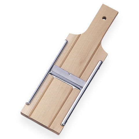 お刺身に添える大根のけんつまに細い千切りが突ける、ホオノキを使用した木柄の千切り調理道具。刃部はステンレスです。お刺身のお供、大根のつまなどに使われています。刃幅は約2ミリ角となります。新鮮な刺身のお供などでお試しください。横端にガイドが付いているので、スムーズにスライスできます。
