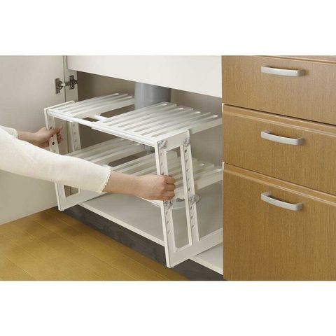 設置簡単!組み立てたまま排水トラップを避けてシンク下に設置できる 幅は伸縮タイプ、棚の高さも3cm間隔でスペースに合わせて調節できます。 耐荷重もそのまま!全体で10kgまでOKです。