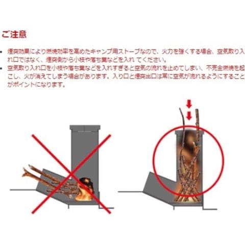 ●煙突効果により燃焼効率を高めたキャンプ用ストーブなので、火力を強くする場合、空気取り入れ口ではなく、煙突側から小枝や落ち葉などを入れ てください。●空気取り入れ口を小枝や落ち葉などを入れすぎると空気の流れを止めてしまい、不完全燃焼を起こし、火が消えてしまう場合があります。