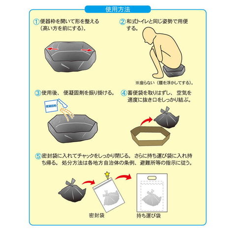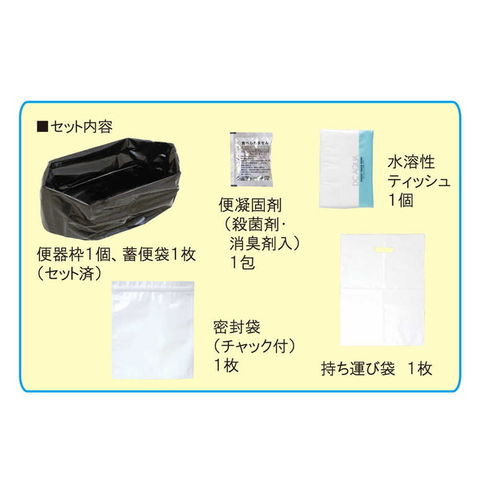 ・コンパクトで持ち運びが手軽な携帯大便用トイレです。 ・便器を広げて置くだけで、どこでもすぐに使用出来ます。 ・使用後、便凝固剤を振り掛けるだけで、便・尿を素早く固めます。 ・チャック付の密封袋をセットしており、使用後の蓄便袋を安心して持ち帰ることが出来ます。 ・水溶性ティッシュ付属です。