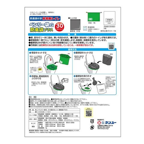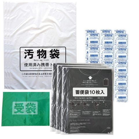 <セット内容> 蓄便袋30枚、便凝固剤30包、汚物袋(防臭袋)3枚、受袋1枚、使用注意ポスター1枚