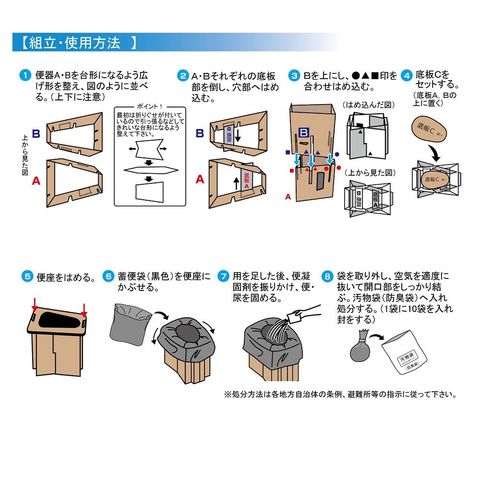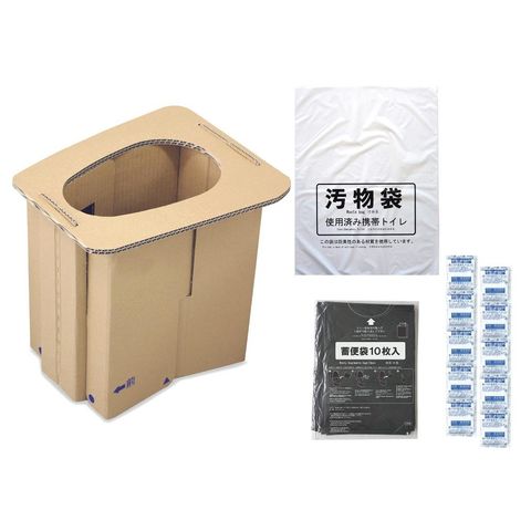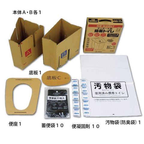 セット内容:便器A,B・便座・底板 各1、蓄便袋、便凝固剤 各10、汚物袋(防臭袋)1