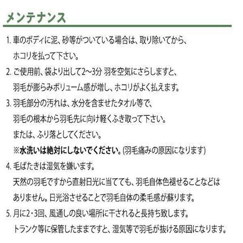 商品説明ベテラン職人が丁寧に手作りした毛ばたき。柔らかい羽根を厳選して使用していますので、車の塗装面にもご使用いただける毛ばたきです。2本使用し、とれたホコリをたたいて落としながら使うと効果的です。羽根の量が多く、耐久性に優れています。車のホコリ払いに最適なアイテムです。※こちらの商品は配送先によってお届けの際の着日・時間指定はできかねます。あらかじめご了承ください。※土日祝の配送に関して:日時指定はお受けできますが、配送時間の指定は対応いたしかねます。あらかじめご了承ください。