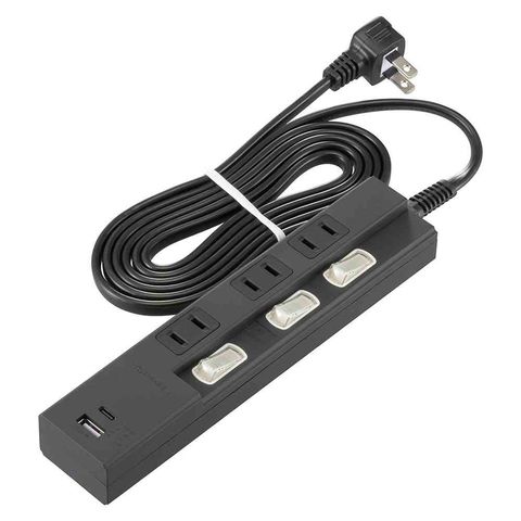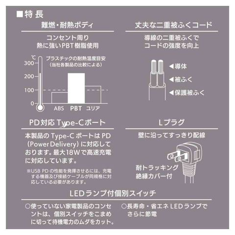USB、Type-C、PD、PowerDelivery対応、最大18Wで急速充電、USB差込口、Type-C、Type-A、TypeA+TypeC、合計3.4A出力、AC差込口、3口、LEDランプ付、1400W、導線、二重被ふくコード、Lプラグ、耐トラッキング、絶縁カバー付、ブラック