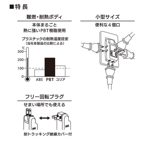 PBT樹脂、難燃素材、耐熱ボディ、コンパクト設計、省スペース、狭い場所対応、耐トラッキング絶縁カバー、フリー回転プラグ、回転プラグ、小型サイズ、4個口、4口コンセント、便利、使いやすい