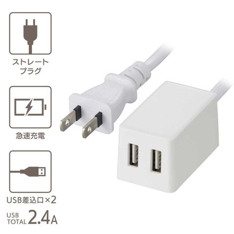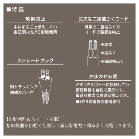 USB充電ポート、2ポート、急速充電対応、USB過電流保護機能、自己消火性PC樹脂活用、導線の二重被ふく、コードの強度向上、耐トラッキング絶縁カバー付き