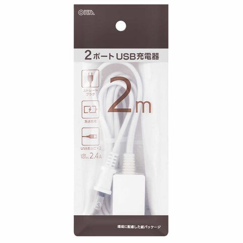 オーム電機 2ポートUSB充電器 2m