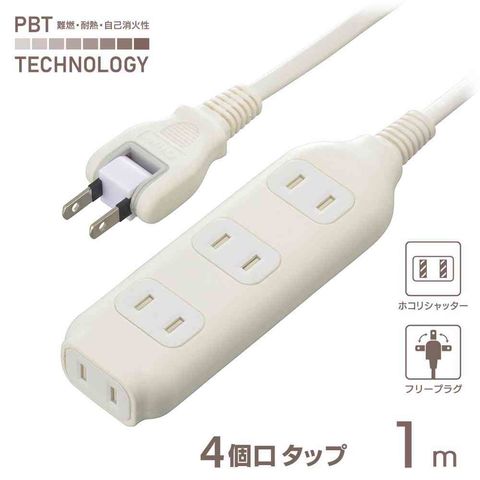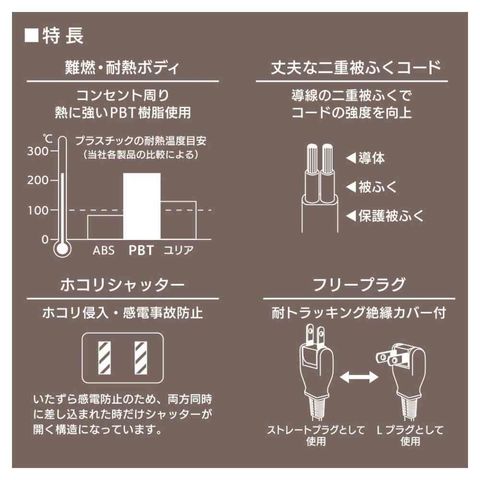 コンセント周り、熱に強い、PBT樹脂使用、難燃、耐熱ボディ、導線、二重被ふく、同時差し込み時のみシャッター開閉、ホコリシャッター、ホコリ侵入防止、感電事故防止、耐トラッキング、絶縁カバー付き、フリープラグ