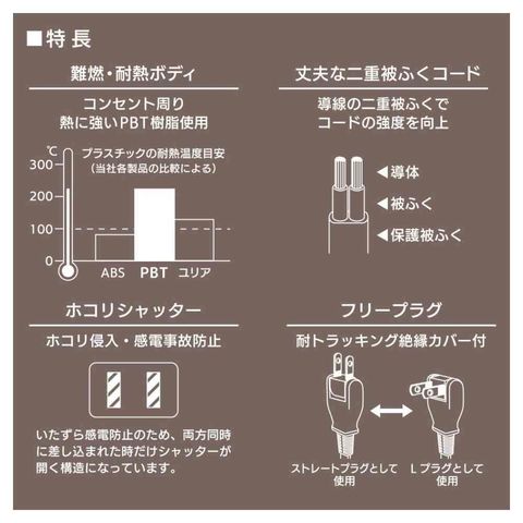 ホコリシャッター、ホコリ侵入防止、感電事故防止、耐トラッキング、絶縁カバー付き、フリープラグ、コンセント周り、PBT樹脂使用、熱に強い、難燃、耐熱ボディ、二重被ふくコード、丈夫