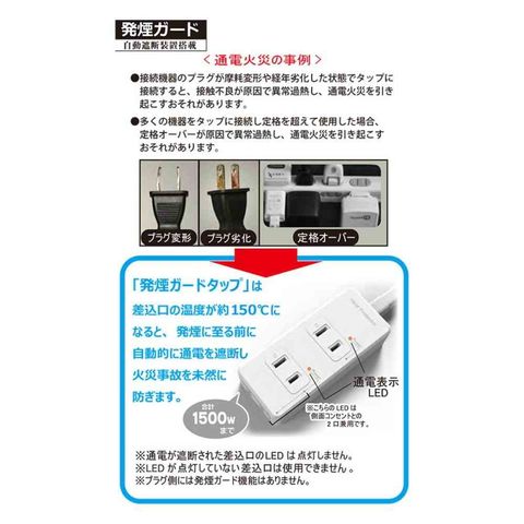 ● 差込口の温度が150℃になると、発煙に至る前に自動的に通電を遮断し、火災事故を未然に防ぎます。 特許技術採用(特許第5853076号)