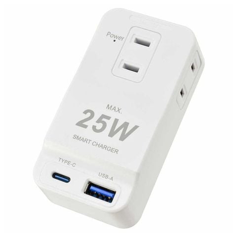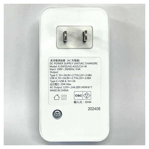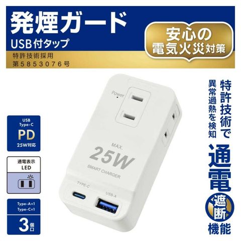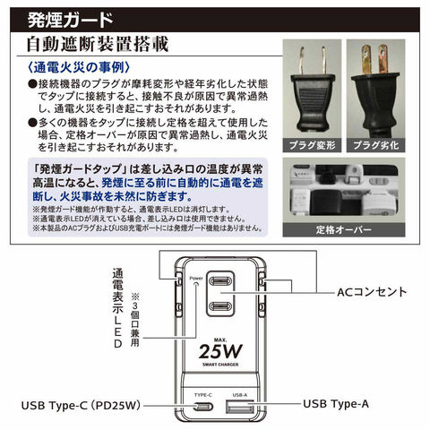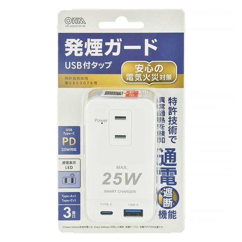 特許技術、異常過熱を検知、通電を遮断、USB、Type-A、Type-C、各1ポート、Type-Cは超急速充電、PD25W、ACコンセント3個口、合計出力1400Wまで、通電表示、LED付き、PSE届出事業者、株式会社オーム電機