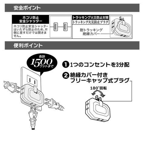 ほこり防止シャッター、コーナータップ、難燃ボディ、耐熱設計、PBT樹脂、3分配、絶縁カバー付きプラグ、180度回転プラグ、トラッキング対策、白
