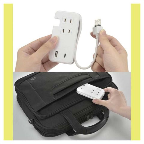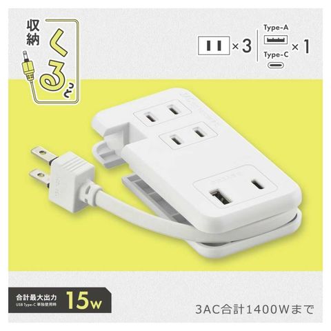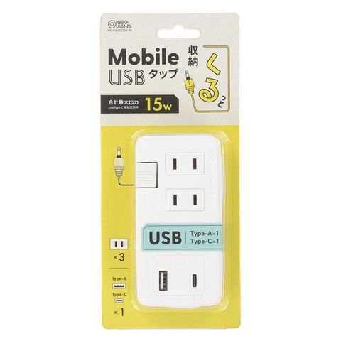 モバイルUSBタップ、くるっと収納、電源タップ、延長コード、ACコンセント、Type-A、Type-C、合計最大出力15W、接続機器を自動で判別、効率よく充電、本体周囲にケーブルが収納、持ち運びに便利、耐トラッキング絶縁カバー付き
