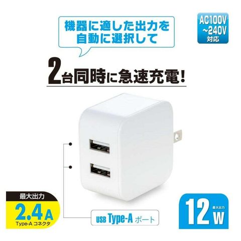 2台同時、急速充電、USB Type-A、2ポート、最大出力12W/2.4A、収納式スイングプラグ、AC100V~240V対応