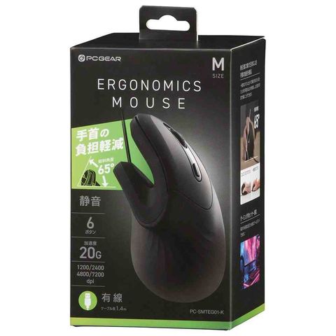 約65度に傾けた形状、手首の負担軽減、一般的なマウスと比べて傾斜がある、握ったときの手首のねじれを軽減、自然な角度で握る、ゲーミング用センサー搭載、快適にゲームをプレイ、静音設計、ボタン数 6、加速度20G、DPI(分解能)、有線接続、USB Type-A