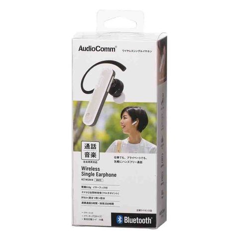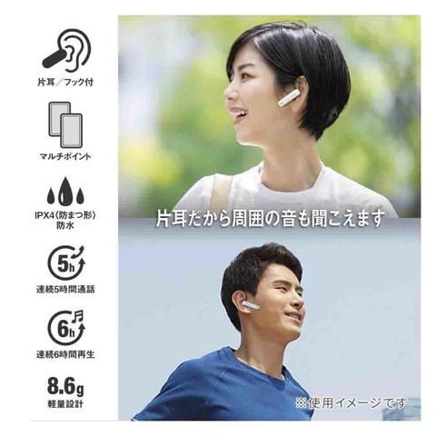 ワイヤレス、シングルイヤホン、着信、通話、軽量設計、カナル型、IPX4、防水保護、運動、作業時、汗、雨でも安心マルチポイント、音量調節、着信拒否、音楽再生、一時停止、スキップ選曲、耳もと操作、音声アシスタント、Bluetooth、ホワイト