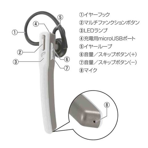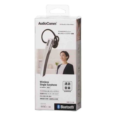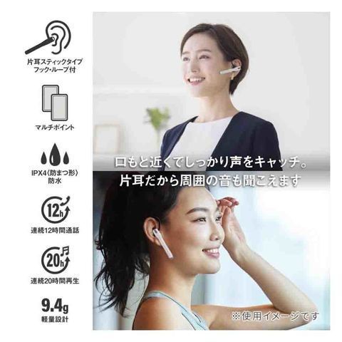 ワイヤレス、シングルイヤホン、通話品質、装着感重視、スタイリッシュイヤホン、スティックタイプデザイン、圧迫感が少ない、軽量フック、ソフトゴム製、ストレス軽減、着信対応、リダイアル、着信拒否、音量調節、音楽再生、一時停止、選曲、耳もと操作、マルチポイント、左右両耳対応、IPX4、防まつ形、防水Bluetooth、ホワイト