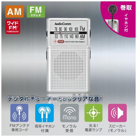 ポケットラジオ イヤホン巻き取り デジタルチューナー クリアな音 収納式片耳イヤホン 着脱式両耳イヤホン付き モノラル受信 モノラルスピーカー搭載 ワイドFM対応光る電源ランプ付き シルバー