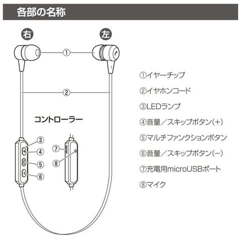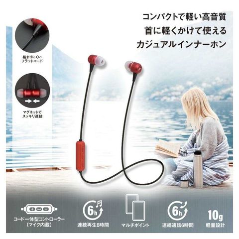 口径10mm、高音質ドライバー、ネックコードタイプ、ワイヤレスイヤホン、フラットコード、ハウジングはマグネット内蔵、左右連結、マイク内蔵、コード一体型コントローラー、通話、再生、音量操作、2台同時待受、マルチポイント対応、充電1時間、連続再生6時間、専用充電コード、軽量設計、Bluetooth、汚れが目立ちにくい、半透明イヤーチップ