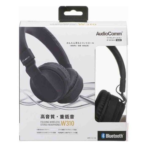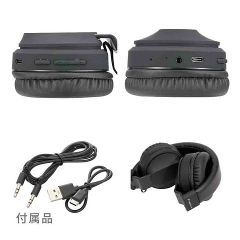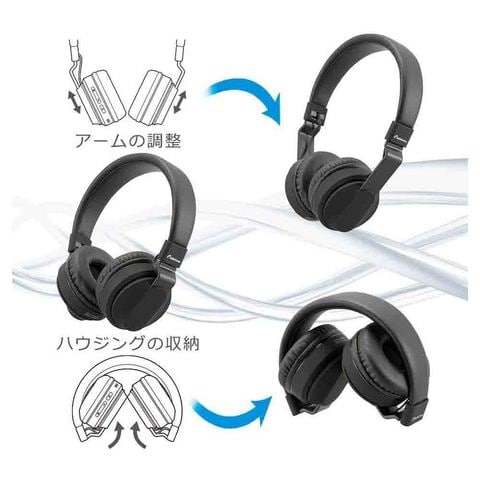 ワイヤレスヘッドホン、耳もとでコントロール、大口径40mmドライバー、迫力サウンド、左右折りたたみ式、コンパクト収納、通話マイク内蔵、スマートフォン通話、マルチポイント機能、外部音声入力端子付き、コード付属、USB Type-C、Bluetooth、ブラック
