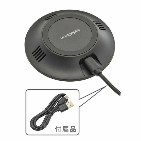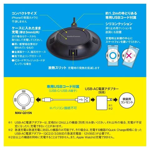 卓上円形タイプ、コンパクトサイズ、Qi規格正規認証品、滑り止め、シリコンクッション付き、放熱スリット、充電時、発熱、低減、約1.2m、ゆとりある専用USBコード付属