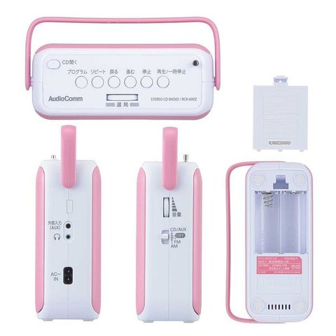 コンパクト、持ち運びラクラク、キュービックデザイン、CDラジオ、背面CDドア、スリムなタテ型スタイル、大きく見やすい照明付き液晶表示、口径57mmスピーカー2基搭載、最大出力0.8W+0.8W、ステレオサウンド、CD-R/RW再生対応、CD再生機能付き、AM、FMステレオ、ワイドFM受信対応、外部音声入力端子付き、外部スピーカー、3.5mm接続コード別売、ヘッドホン出力端子付き、コンセント、電池の2電源方式、専用電源コード付属、電池別売、ピンク