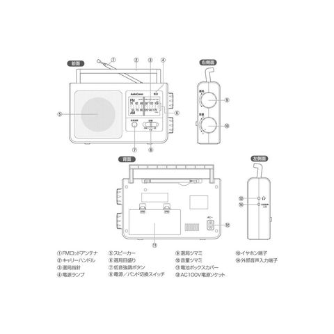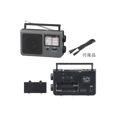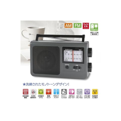 モノトーンデザイン、低音強調機能付き、スピーカー搭載、イヤホン端子付き、外部音声入力端子付き、ワイドFM対応、電源ランプ、FMロッドアンテナ、キャリーハンドル付き、専用電源コード付属