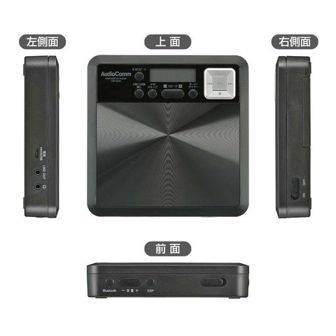 語学学習、リピート機能、スピード調整、ワンタッチプレイバック、オフタイマー、らくらくスキップ、Bluetooth搭載、ワイヤレスイヤホン、レジューム再生機能付、低音強調機能付き、迫力ある音楽再生、音飛び防止機能付き、MP3ディスク再生対応、音声出力端子付き、乾電池/USB2電源対応、USB電源コード付属、再生/一時停止、音量調節、スキップ、コントローラー付属、ホールド機能、ボタンの誤操作を防止、立てて使える、スタンド付き、本体一体型、2段階調節、ステレオイヤホン付属、ブラック