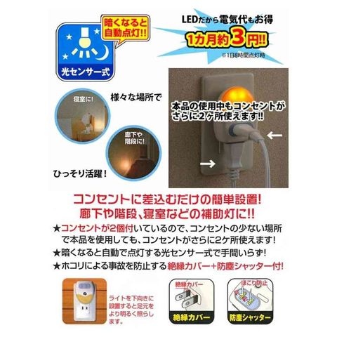 コンセント差込式、簡単設置、自動点灯、自動消灯、光センサー、廊下用、階段用、寝室用、補助灯