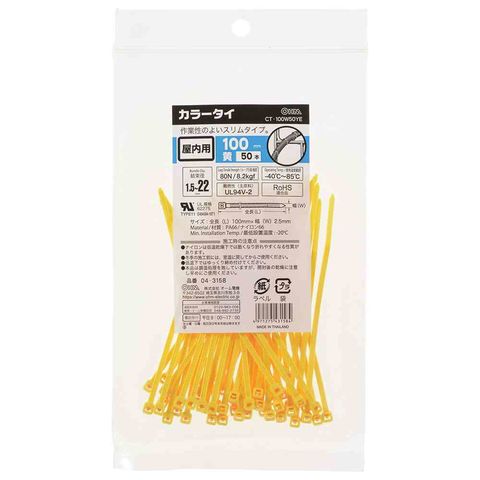 オーム電機 カラータイ 屋内用 100mm 黄 04-3158 50本入