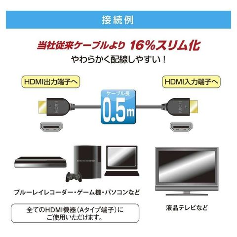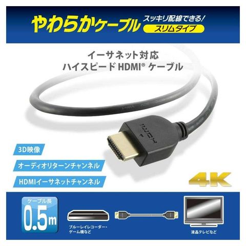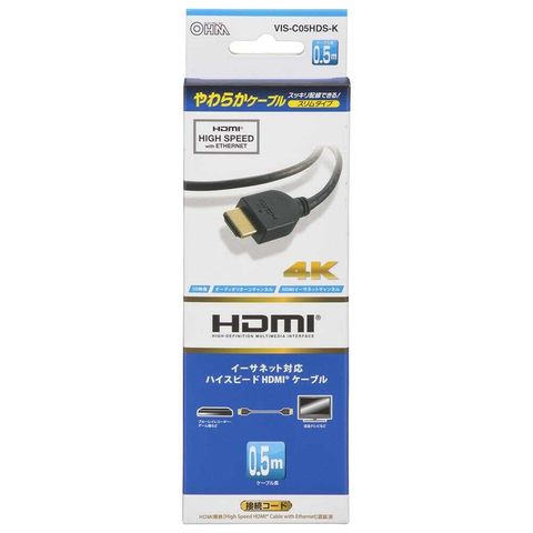 オーム電機 HDMIやわらかケーブル スリムタイプ ハイスピード 0.5m 1本