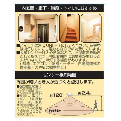 人の動きを検知、自動点灯、点灯時間約120秒、人感・明暗センサー機能付き、配光角約120°、電球色40W相当の明るさ、内玄関・廊下・階段・トイレにおすすめ、屋内専用