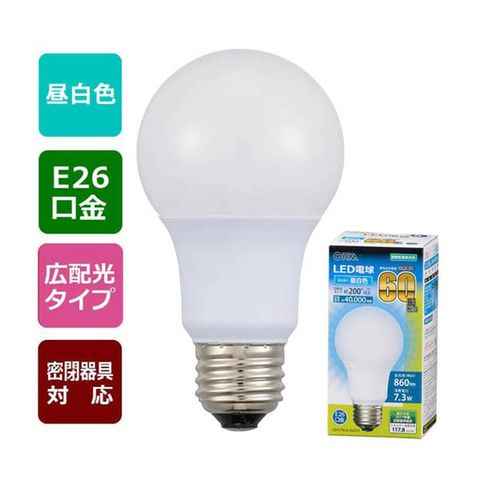 白熱電球60W相当、配光角約200°以上、広配光タイプ、密閉形器具対応、昼白色、E26口金