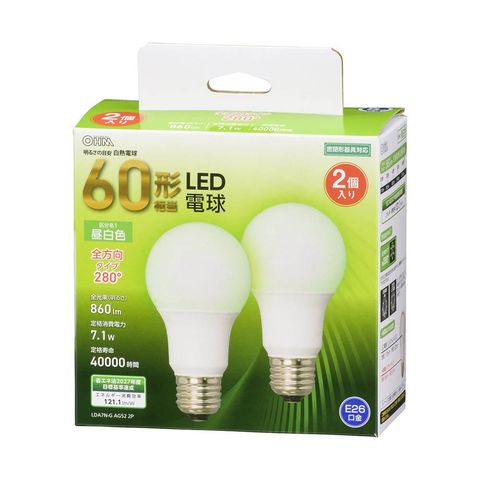 定格寿命40000時間、全光束860ルーメン、白熱電球60形相当、光の広がり約280°、全方向タイプ、密閉形器具対応、省エネ、昼白色、E26口金、2個入り