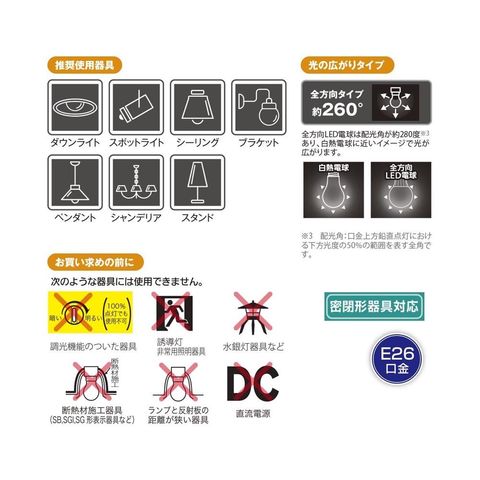 ※次のような器具には使用できません。 ・調光機能のついた器具(100%点灯でも使用不可) ・誘導灯、非常用照明器具 ・水銀灯器具など ・断熱材施工器具(SB・SGI・SG形表示器具など) ・ランプと反射板の距離が狭い器具 ・直流電源 ※このほか使用器具の種類によって寸法的、熱的、その他の状況(リモコン機器のついた器具など)により使用できない場合があります ※ご使用になられる照明器具の構造によっては、放熱不良で短寿命となることがあります ※密閉器具でのご使用の場合、器具の寸法の大きさにより、使用できない場合や寿命が短くなる場合があります