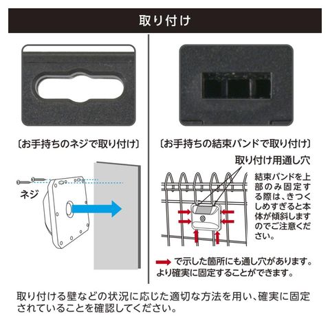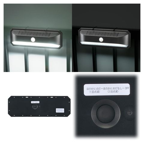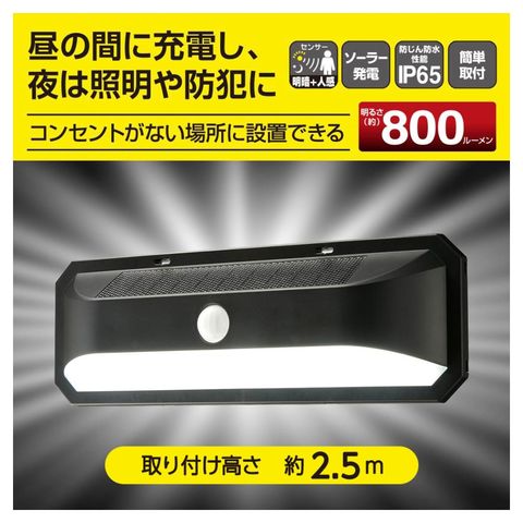 コンセントがない場所に設置できる、ソーラー発電式、昼の間に充電、暗くなったら人感センサーで検知、点灯、明るさ約800ルーメン、選べる2つのモード、周囲が暗くなるとほのかに点灯、動きを検知するとしっかり点灯モード、通常モード、周囲が暗くなっても点灯せず、動きを検知した時だけ、しっかり点灯モード、省エネモード、IP65、防じん防水性能