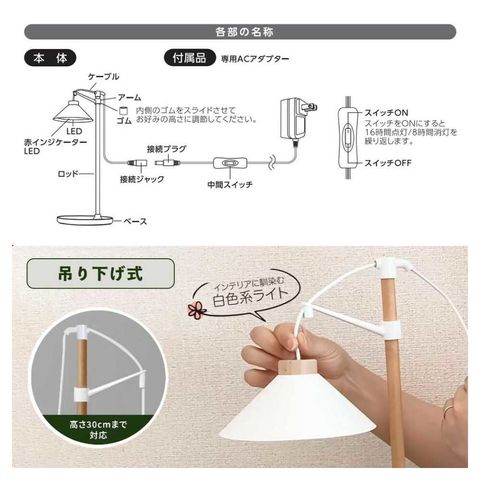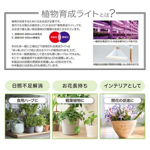 室内で太陽光の補完、植物育成ライト、お部屋に馴染む白色の光、平均演色評価数、Ra95、16時間点灯、8時間消灯、繰り返す、オートタイマー機能付き、設置高さ約30cm
