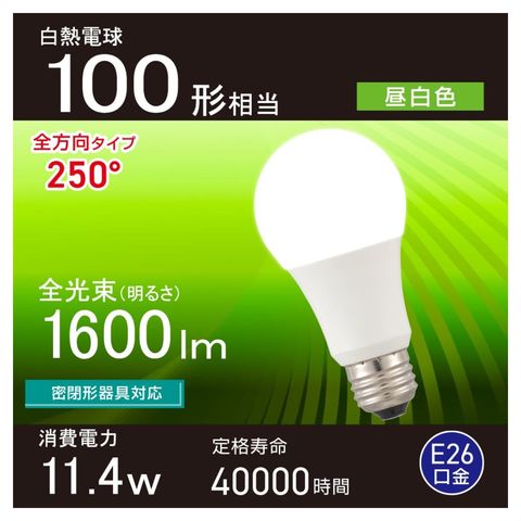 全光束1600ルーメン、白熱電球100形相当の明るさ、光の広がり約250°、全方向タイプ、密閉形器具対応、省エネ法2027年度目標基準達成、E26口金、昼白色、5年保証対象商品