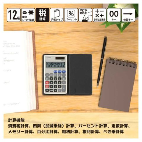 電卓、ソーラーパネル、電池、ダブルパワー、手帳カバー付属、持ち歩きに便利、税計算機能、簡単設定、12桁表示、早打ち対応、修正キー