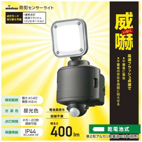 センサーライト、防犯、明るさ400ルーメン、不審者に警告、不審者、点灯モード切り替え、点灯時間調節可能コンビネーションモード、通常点灯モード、高速フラッシュモード、昼光色、保護等級はIP44、防じん防まつ形、ネジ止め、クランプ止め、ステンレスバンド止め、配線不要、乾電池式