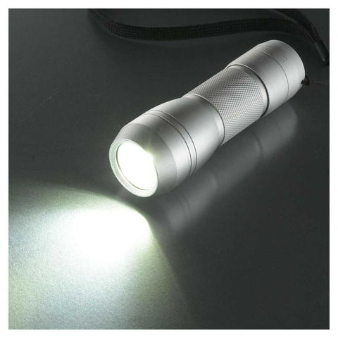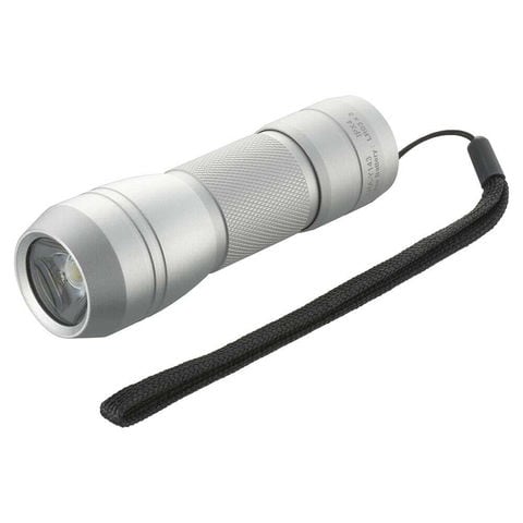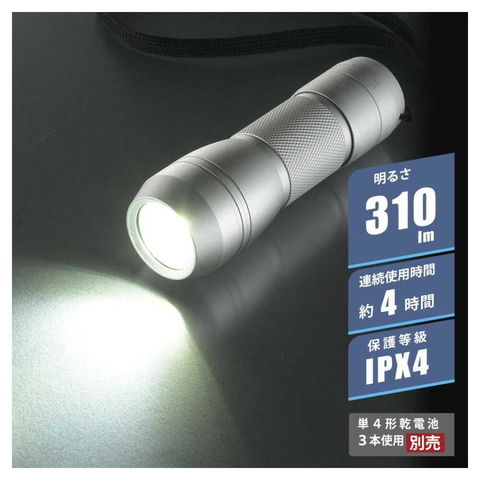 明るさ310ルーメン、連続使用時間約4時間、保護等級IPX4、照射距離約140m、携帯ストラップ付き、アルミボディ