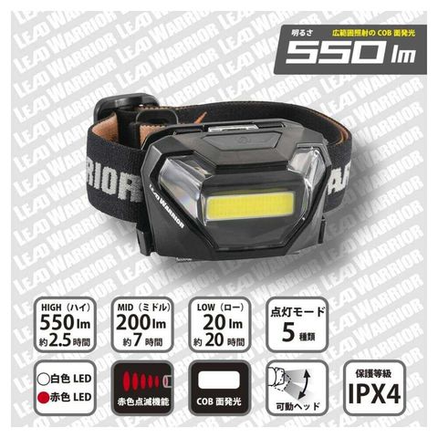 広範囲照射、COB面発光、5種点灯モード、赤色LED、可動ヘッド、180カンデラ、約550ルーメン、連続使用時間約2.5時間、照射距離約25m、落下耐性約1m、IPX4、防まつ形