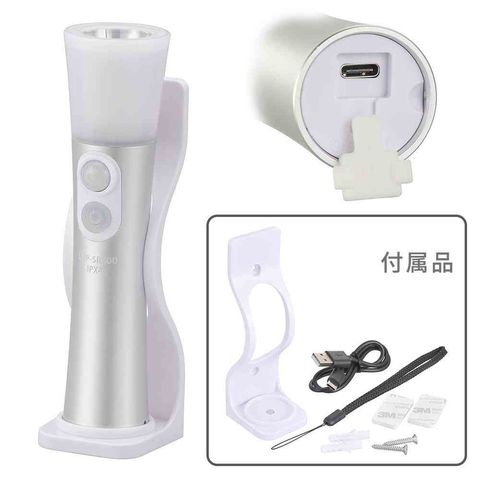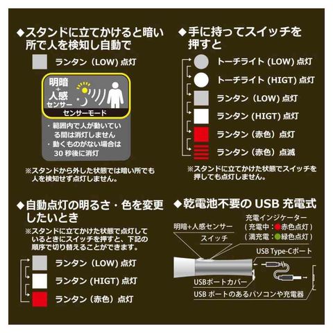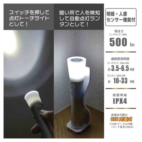 トーチライト、ランタン、スタンドに立てかけると暗い所で人を検知、自動点灯、消灯、調光、HIGH、LOW、赤色点灯、赤色点滅モード付き、明るさ500ルーメン、トーチライト、HIGHモード時、保護等級はIPX4、防まつ形、乾電池不要、USB充電式