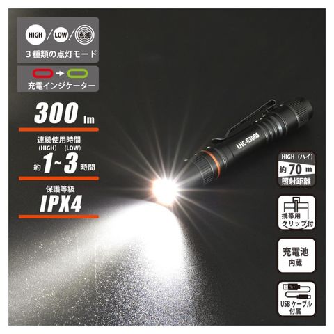 3種類の点灯モード、点滅、300ルーメン、保護等級IPX4の防まつ形、USB充電式、携帯用クリップ付き、FL1、STANDARD
