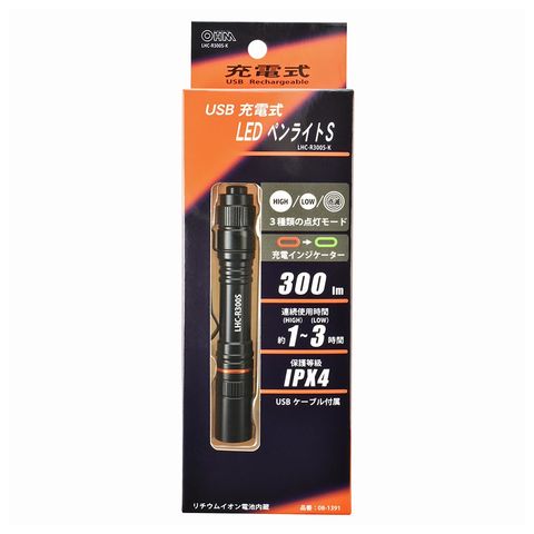 オーム電機 USB充電式LEDペンライト 300ルーメン 1個