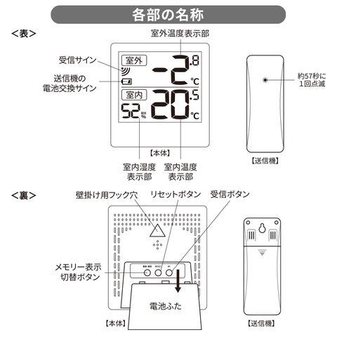 温湿度計 室内の温湿度 室外温度計測 屋外に送信機設置 温度計測 見やすい大画面表示 最高・最低温湿度 メモリー機能付き 置き・掛け両用 特定小電力 技術基準適合品