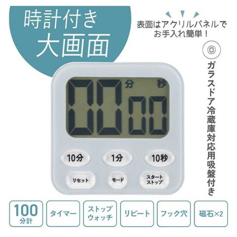 大画面、時計、100分計、タイマー、ストップウォッチ、リピート、フック穴、裏面に磁石2個、吸盤