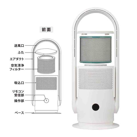 扇風機、ファン、空気清浄機、空気清浄機一体型、羽根なしタイプ、安全、お手入れも簡単、フィルター交換も簡単、左右首振り、前後角度調整、10段階風量調整、リモコン付き、花粉症、ダニ、集塵、PM2.5、受動喫煙、約11畳用