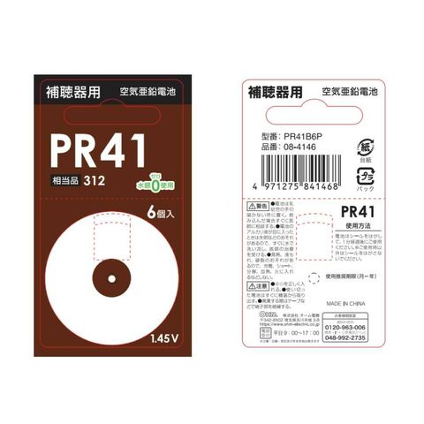 オーム電機 空気亜鉛電池 補聴器用PR41 PR41B6P 6個入
